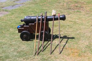 Brits marinekanon uit de 18e eeuw met gereedschap (Kasteel de Goede Hoop, Kaapstad).