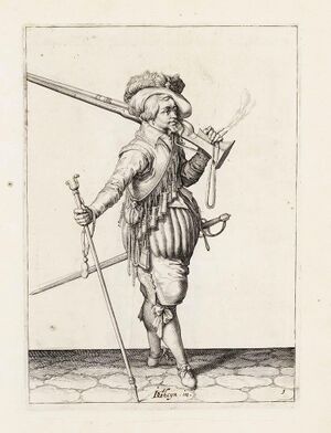 Musketier (uit de Wapenhandelinghe van Roers, Musquetten ende Spiessen, Jacob de Gheyn, 1607)
