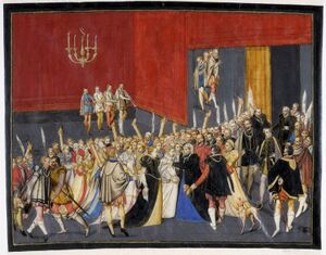 Mansfeld en zijn vrouw stellen de infante Maria voor aan haar schoonmoeder Margaretha van Parma (Album van Brussel, ca. 1565)[1]