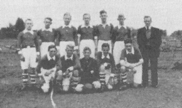 Het allereerste elftal - Augustus 1940 Staand v.l.n.r.: Klaas Kemmeren, Piet Broeders, Martien Kanters, Jan Snijders, Rinus v.d. Boogaard, Jo de Bont, Thijsje van Helvert (leider) Knielend v.l.n.r.: Rinus Oome, Kees Oome, Han de Groot, Han van Amelsvoort, Johan v.d. Westen