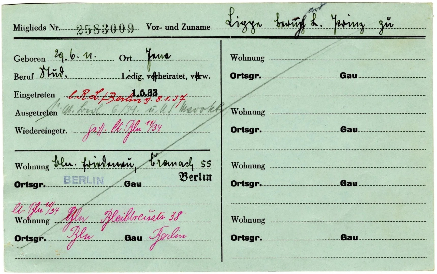 De NSDAP-lidmaatschapskaart van prins Bernhard (Koninklijke Verzamelingen)
