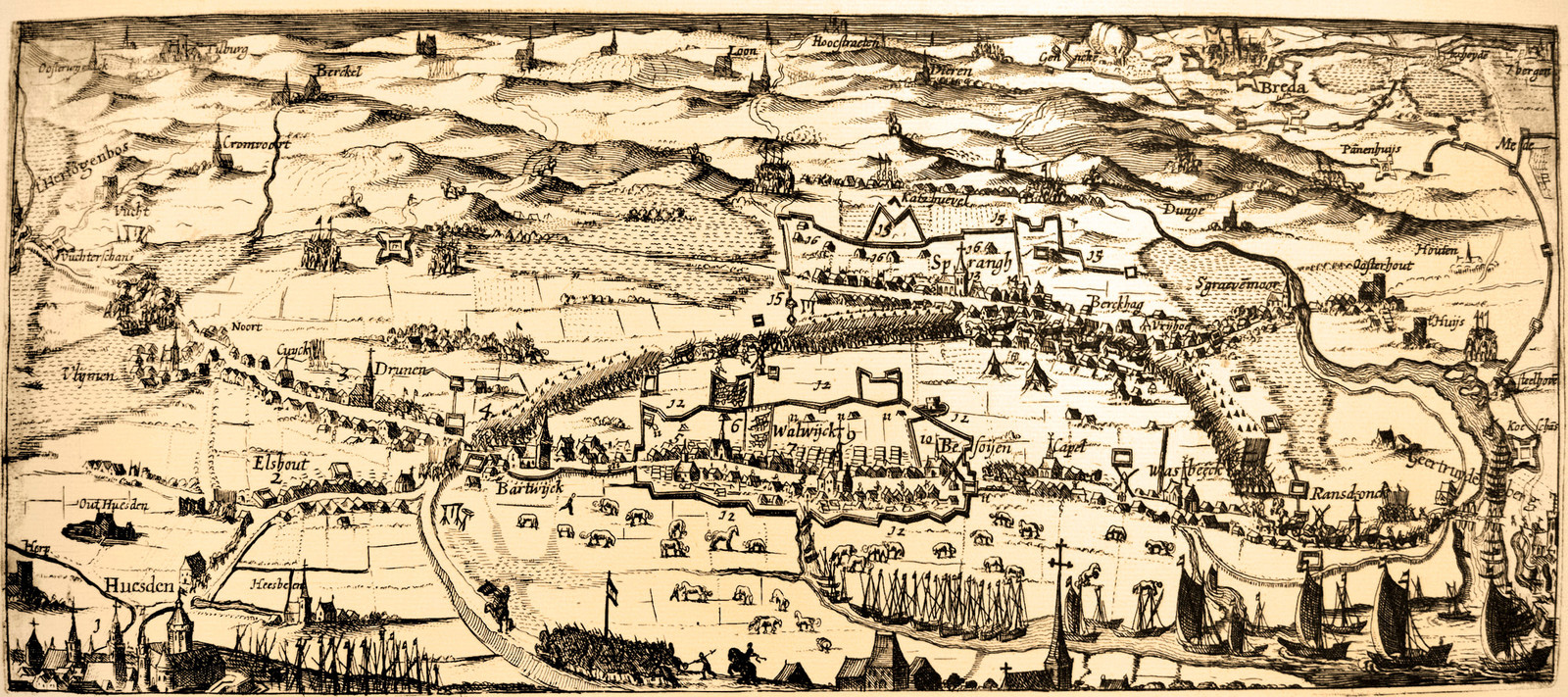- De stad Heusden waar de heer van Kessel zijn hof houdt. Hier verzamelen alle schepen met de munitie voor de oorlog te weten het kanon, kruit, loot (kogels), scheppen en houwelen. Er wordt hier alle dagen steeds meer naar het legeer aangevoerd. Er staan al 20 schuiten op wagens gereed en enkele nieuwe stootwagens (op een vreemd manier gemaakt) die voor de aanval dienen.