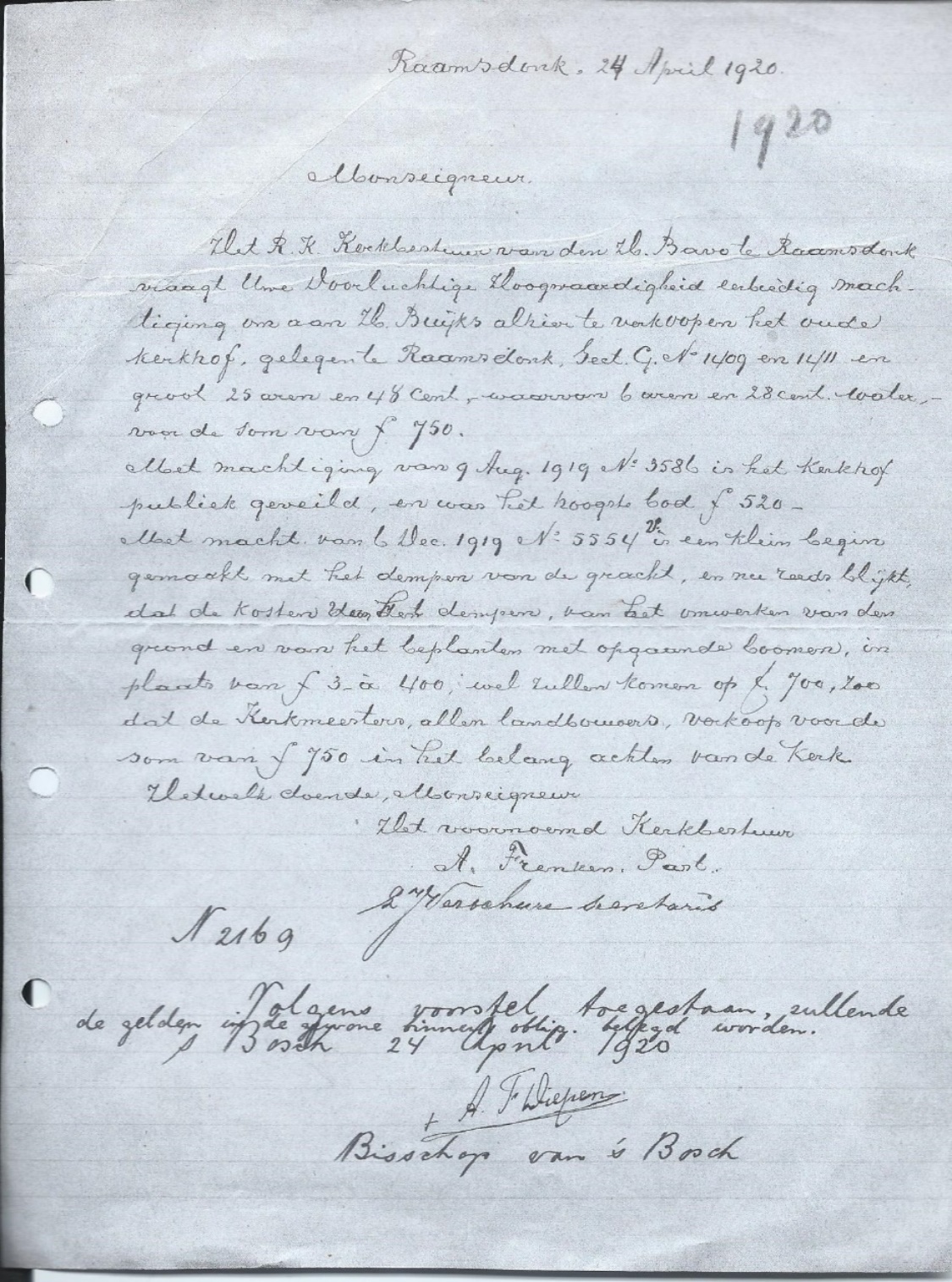 Onderstaand een schrijven van 24 april 1920 van het parochiebestuur aan: