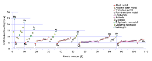 De eerste ionisatiepotentiaal is de energie die nodig is om één elektron uit een atoom te verwijderen; de tweede ionisatiepotentiaal is de energie die nodig is om vervolgens een tweede elektron uit het atoom te verwijderen, enzovoort. Bij een gegeven atoom zullen opeenvolgende ionisatiepotentialen toenemen bij toenemende ionisatiegraad. Magnesium bijvoorbeeld heeft als eerste ionisatiepotentiaal 738 kJ/mol en als tweede 1450 kJ/mol. Elektronen in de dichter bij de kern gelegen orbitalen ondervinden een sterkere elektrostatische aantrekking, waardoor hun verwijdering steeds meer energie vereist. De ionisatiepotentiaal neemt toe als men in het periodiek systeem van links naar rechts en van beneden naar boven gaat.